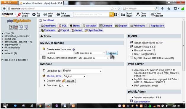 4.selanjutnya buka mozila firefox kemudian ketik localhost/phpmyadmin untuk membuat nama database,dan klik create apabila sudah membuat nama database seperti pada gambar dibawah ini: