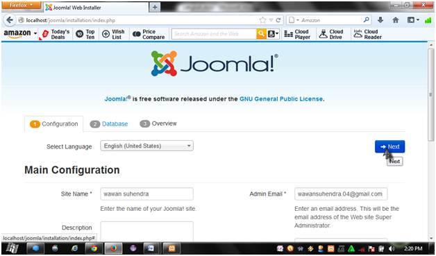 5.langkah selanjutnya ketik localhost/joomla untuk menginstal joomla,yaitu masukan site name sesuai keinginan kita,masukan email kita,masukan passpord kemudian klik next jika sudah terisi semua seperti pada gambar dibawah ini: