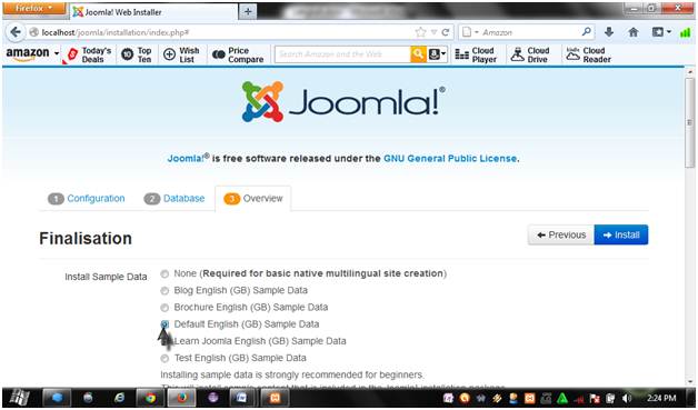 7.pada tampilan finalization install sample data klik “default English(GB)sample data”kemudian klik install seperti pada gambar dibawah ini: