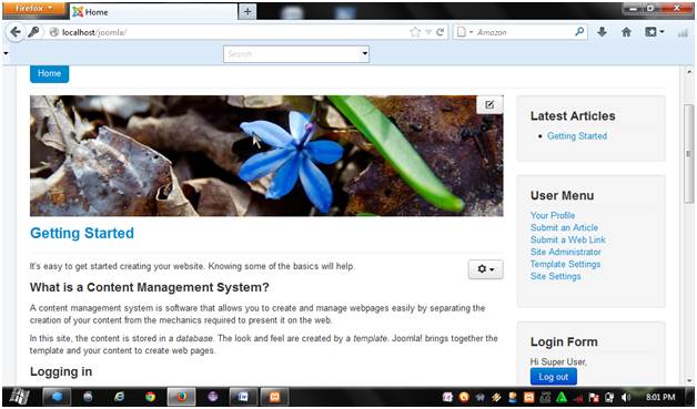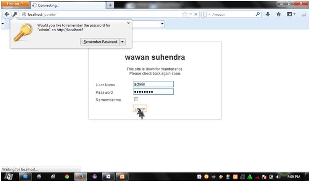 9.klik “localhost/joomla”pada tab mozila firefox masukan user name dan password untuk masuk ke home joomla seperti pada gambar dibawah ini:
